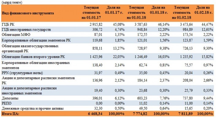 По состоянию на 1 февраля 2018 года текущая стоимость портфеля пенсионных активов ЕНПФ составила 7 811,89 миллиарда тенге, увеличившись за месяц на 37,7 миллиарда тенге.