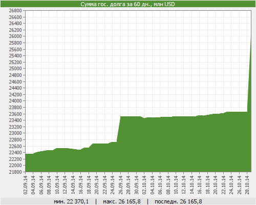 Сумма госдолга Казахстана, выпущенного в виде ГЦБ, установила новый максимум. Согласно данным биржи, по состоянию на 30 октября внутренний госдолг Казахстана по ценным бумагам в тенге достиг 4,7 триллиона, а в долларах - около 26,2 миллиарда. При этом, суммарная рыночная стоимость размещенных государственных облигаций, торгующихся в официальном списке KASE, на 30 октября составила около 24,3 миллиарда долларов.