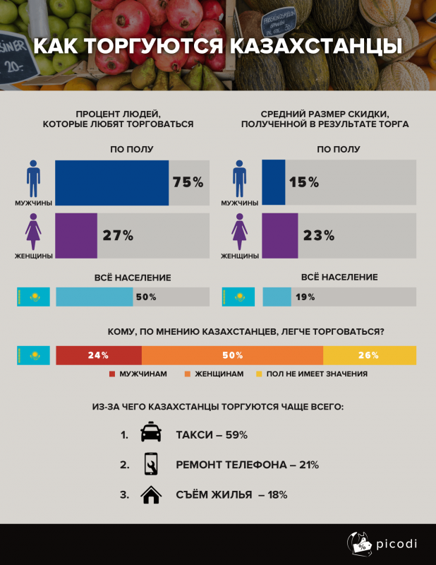 В среднем казахстанцам удается скинуть 19 процентов от первоначальной стоимости товара или услуги. Однако, несмотря на то, что жительницам РК нравится торговаться меньше, чем мужчинам, результативность женской части населения была выше - 23 процента против 15 процентов у мужчин.