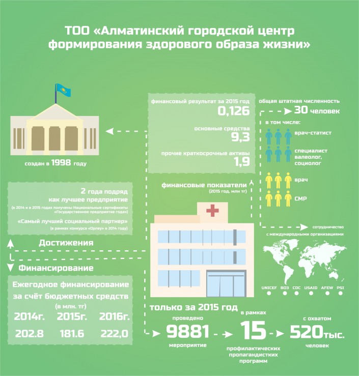В 2015 году "Городским центром формирования здорового образа жизни" было проведено около десяти тысяч мероприятий в рамках 15 профилактических программ с общим охватом в 520 тысяч человек. Центр сотрудничает с такими международными организациями, как UNICEF, USAID, Всемирная организация здравоохранения и другими. Центр дважды становился обладателем национального сертификата "Государственное предприятие года".