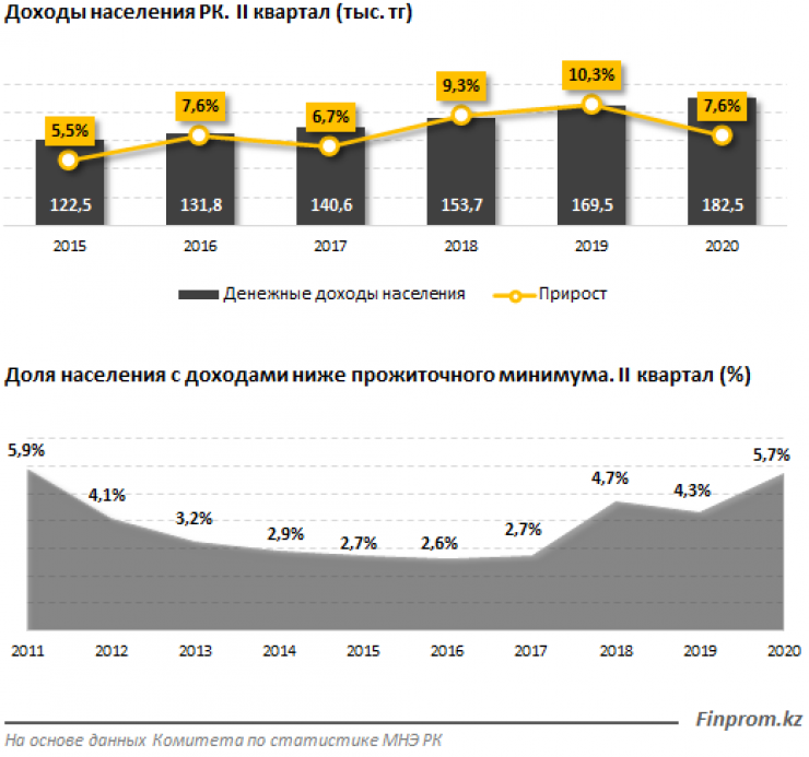 Во втором квартале текущего года доля населения страны с доходами ниже прожиточного минимума увеличилась до 5,7 процента (годом ранее - 4,3 процента), что является худшим показателем с 2011 года. Это произошло на фоне снижения экономической активности в стране, а также общих негативных последствий коронакризиса. Напомним, во втором квартале 2020 года величина прожиточного минимума по Казахстану в среднем на душу населения составила 32,6 тысячи тенге.