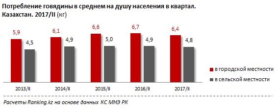 С ростом цены на говядину уменьшается ее потребление. Так, во втором квартале 2017 года потребление говядины в среднем на душу населения составило 6,4 килограмма в городской местности и 4,8 килограмма в сельской местности, что на 4,3 процента и 2,2 процента меньше по сравнению со вторым кварталом прошлого года.