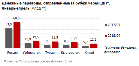 Наибольший объем переводов за январь-апрель 2018 года был отправлен в Россию - 69,6 миллиарда тенге, рост за год на 31,2 процента, доля страны в общем объеме переводов снизилась с 45,5 процента до 43,8 процента.