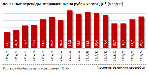 По данным аналитиков, объем денежных переводов населением из РК за рубеж в апреле текущего года составил 45,6 миллиарда тенге, что на 9,5 процента больше, чем в марте, и на 36,6 процента больше, чем годом ранее.