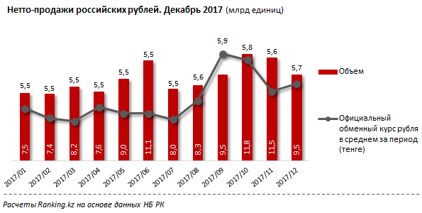 Наиболее высокий спрос на российские рубли у казахстанцев пришелся на октябрь-ноябрь 2017 года. объем нетто-продаж составлял 11,8 и 11,5 миллиарда рублей соответственно. Притом за месяц до этого, в сентябре 2017-го, курс рубля в среднем составлял 5,9 тенге за один рубль, после чего уменьшился до 5,8 тенге в октябре и до 5,6 тенге в ноябре прошлого года.