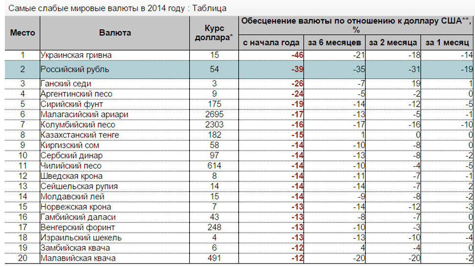 Сообщается, что по темпам девальвации российская валюта уступила только гривне. С начала этого года в долларовом выражении рубль потерял почти 40 процентов своей стоимости, тогда как украинская валюта - 46 процентов.