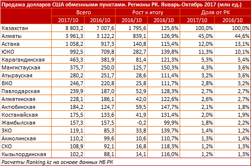 Также лидирует Алматы - обменными пунктами города было продано населению 18,8 миллиарда рублей, рост за год на 8,5 процента (1,5 миллиарда рублей). Доля от РК за год уменьшилась с 16,1 процента до 14,6 процента.