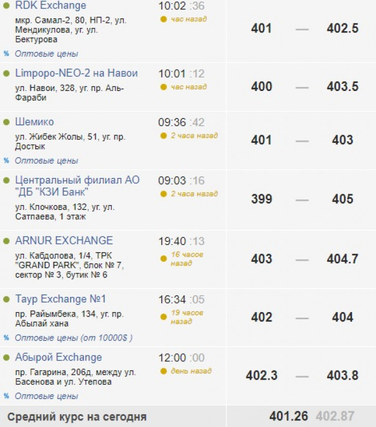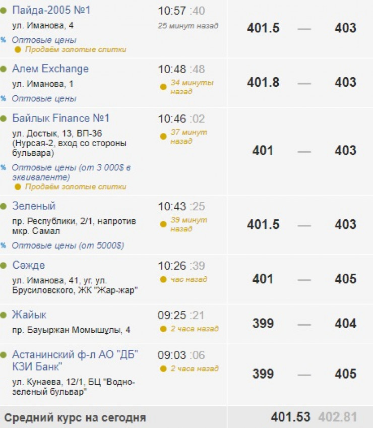 А по данным Kurs.kz, в обменниках Алматы доллар продают по 402,5-405 тенге, а покупают по 399-403 тенге.