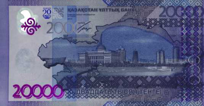 "Слева в верхней части банкноты расположен крылатый конь, принятый во многих культурах, включая тюркоязычные и кочевые народы, как символ чистого света и жизни, вдохновения и плодородия, целеустремленности и власти. Посередине внизу банкноты расположено изображение триумфальной арки Мәңгілік Ел - архитектурное отражение идеи вечности свободной страны, национальной идеи общеказахстанского дома. На оборотной стороне основным изображением в центре банкноты выступает контур карты Казахстана и панорама столицы - Астаны со зданиями Акорды, Парламента и правительства, расположенными в порядке, отражающем принцип разделения ветвей власти, заложенный в Конституции Республики Казахстан", - говорится в сообщении.