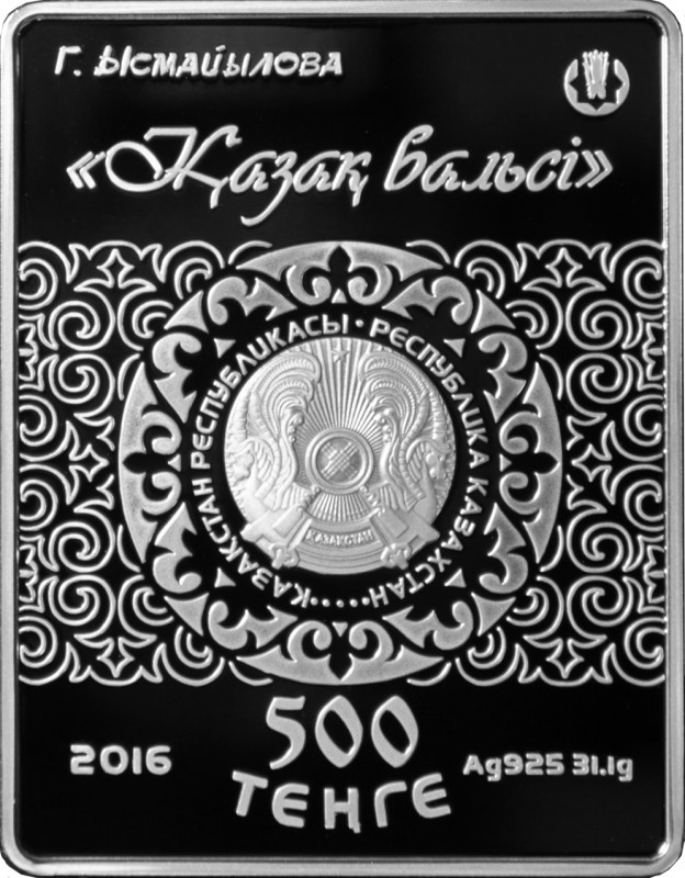 В нижней части проходит надпись "500 ТЕҢГЕ", обозначающая номинал монеты, число "2016", обозначающее год чеканки, и надпись "Ag 925 31.1 g.", обозначающая металл, из которого изготовлена монета, его пробу и массу. В верхней части - надписи "Г. ЫСМАЙЫЛОВА", "ҚАЗАҚ ВАЛЬСІ" на государственном языке и логотип Национального Банка Республики Казахстан.