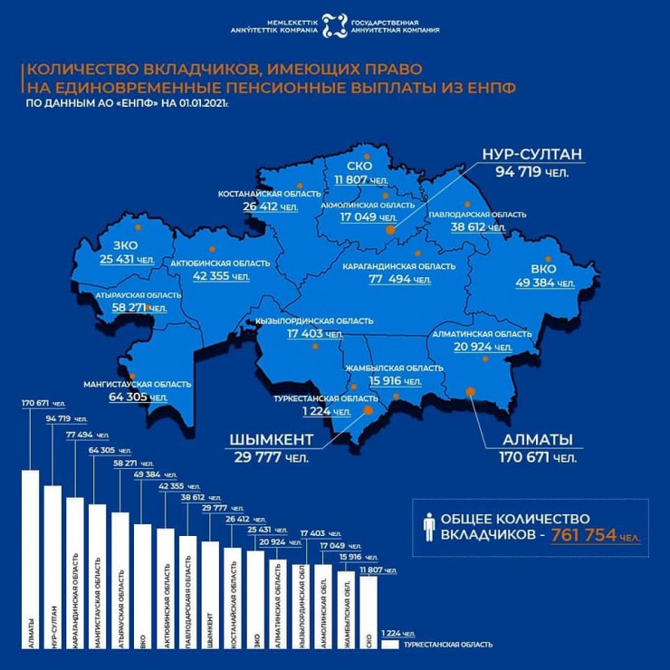 Меньше всего имеющих право снимать пенсионные в Туркестанской области - лишь 1224 человека, в 139 раз меньше, чем в Алматы. При этом Шымкент находится в середине списка - 29 777 человек.
