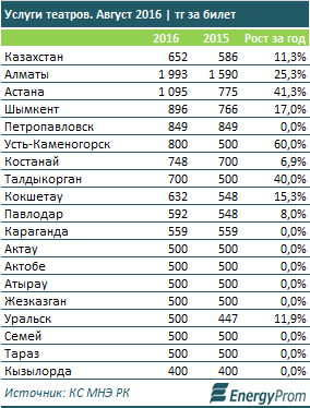 В свою очередь для театралов средняя цена за билет составляла в августе 652 тенге (рост на 11,3 процента за год). "Самые высокие цены на билеты в исследованных больших городах отмечены в Алматы (1 993 тенге, рост на 25,3 процента за год), Астане (1 095 тенге, на 41,3 процента) и Шымкенте (896 тенге, на 17 процентов). Самое значительное удорожание зафиксировано в Усть-Каменогорске (сразу на 60 процентов, до 800 тенге за билет)", - привели такие данные специалисты службы.
