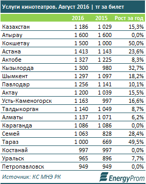 Билеты в кино в Казахстане подорожали за год на 15,3 процента, сообщают специалисты аналитической службы Energyprom.kz. По итогам августа, одно посещение кинотеатра обходилось зрителям в среднем в 1 186 тенге за билет.