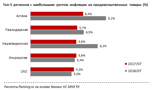 В секторе продовольственных товаров самый резкий рост цен был зафиксирован в Астане - с декабря 2016 по июль 2017 стоимость их увеличилась на 6,4 процента. В прошлом году за 7 месяцев инфляция составила сразу 9,2 процента.