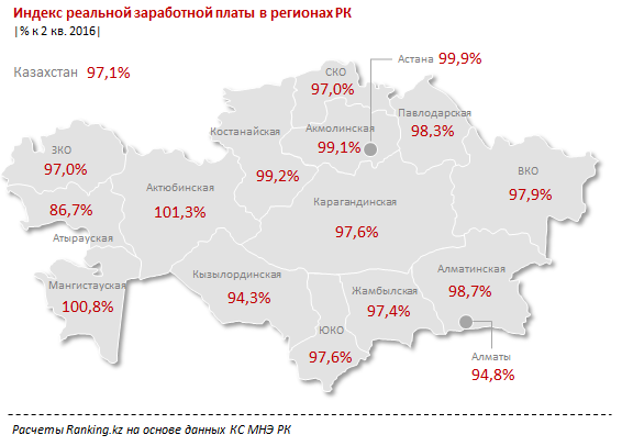 Во втором квартале 2017 года всего в двух регионах РК был зафиксирован рост реальных зарплат - в Актюбинской области (на 1,3 процента) и в Мангистауской области (на 0,8 процента).