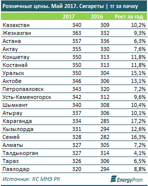 По данным аналитиков, рост цен закономерен, учитывая регулярное повышение акцизов на табачную продукцию. В этом году по сравнению с 2016 годом они выросли на 24 процента - с 5 000 тенге за 1 000 штук до 6 200 тенге. В 2018 году ставки планируют поднять до 7 500 тенге, в 2019 году - до 8 700 тенге.