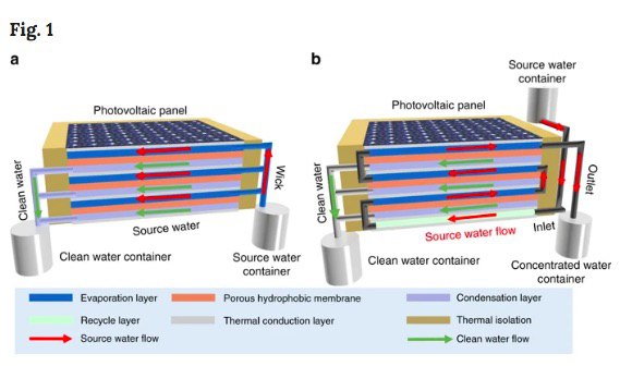 Как сообщают исследователи, они сконструировали трехступенчатый мембранный дистиллятор, испаряющий морскую воду при относительно низких температурах, и прикрепили его к задней части фотоэлектрической панели.