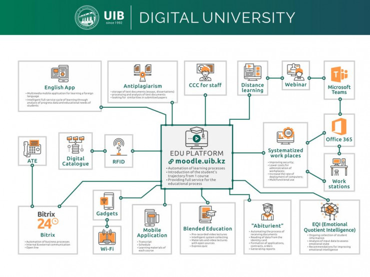 "За последние годы нами накоплен богатый опыт по современной методологии организации и формам взаимодействия с обучающимися при онлайн-обучении на примере новых программ MBA. Сегодня GSB UIB предлагает executive и модульно-дистанционный форматы обучения в MBA. Для организации социального развития и карьерного роста наших студентов через оценку и формирование необходимых компетенций уже сейчас внедряются новые цифровые сервисы: UIB_Social_development, UIB_ROS и UIB_Jumys. Реализуя свою третью миссию, UIB готов оказать дальнейшую поддержку школам и колледжам нашего города в организации онлайн и ДО", - отмечает президент Университета UIB Дархан Ахмед-Заки.