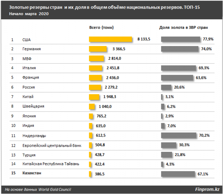 Казахстан на отчетную дату занимает 15-е место в общемировом рейтинге по запасам золота, и 13-е место - среди государств (без учета Международного валютного фонда и Европейского центрального банка). На начало марта запасы золота в стране составили 386,5 тонны. Таким образом, в текущем году Казахстан по запасам золота в золотовалютных резервах обогнал, к примеру, Португалию.