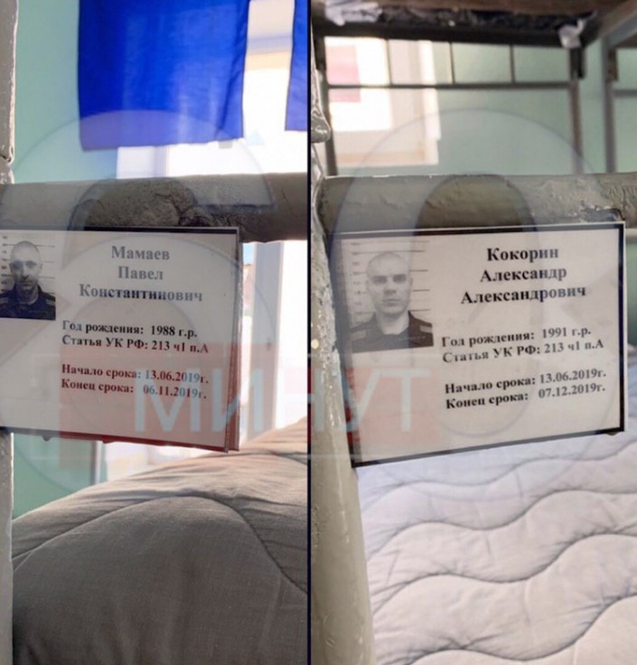 На снимке видны кровати с табличками, на которых есть фотографии спортсменов в тюремной одежде, указаны их годы рождения, номер статьи, даты начала и окончания срока.
