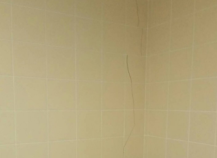 Местные жители рассказали изданию, что после двух дней дождей крыша здания протекла, стали отваливаться фрагменты потолка и штукатурка, плитка в туалете и краска на стенах пошли трещинами, есть подтеки ржавой воды в помещениях.