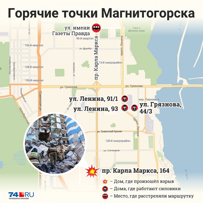 Рано утром 31 декабря в Магнитогорске, по предварительным данным, в результате взрыва бытового газа произошло обрушение одного из подъездов десятиэтажного жилого дома по адресу: проспект Карла Маркса, дом 164. В зоне обрушения проживали 120 человек. В результате трагедии, по последним данным, погибли девять человек. Местонахождение 32 человек пока остается неизвестным.
