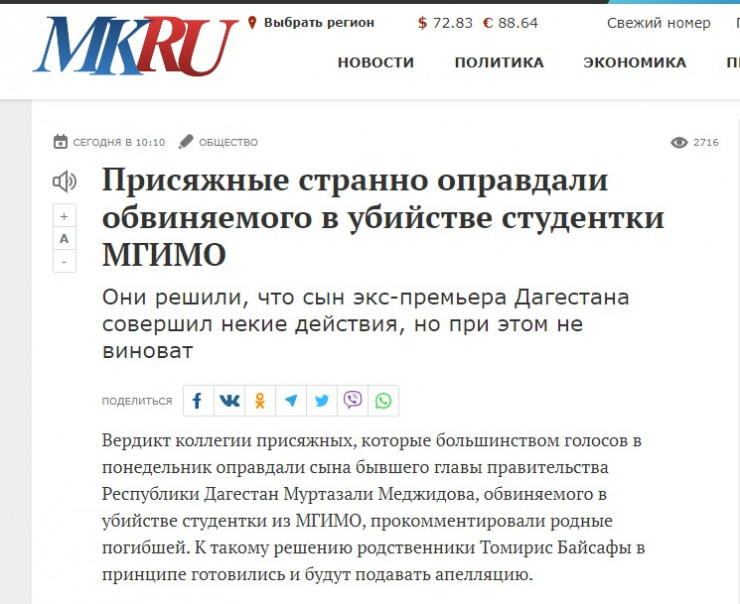 Издание обозначило вердикт присяжных так: "Присяжные странно оправдали обвиняемого в убийстве студентки МГИМО. Они решили, что сын экс-премьера Дагестана совершил некие действия, но при этом не виноват.