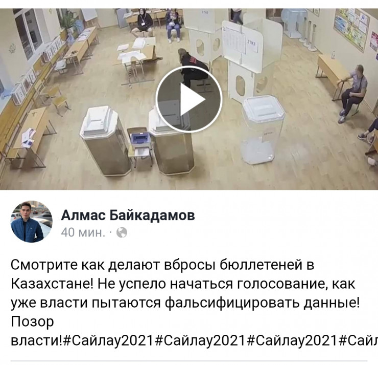 В Facebook опубликована видеозапись с камеры наблюдения на избирательном участке. На этой записи можно увидеть вброс бюллетеней в урну для голосования. Автор поста утверждает, что это произошло в Казахстане. На самом же деле видеозапись старая и была сделана в июле прошлого года в Москве, сообщает Stopfake.kz, передает Tengrinews.kz.