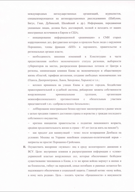 Сканы документов хакеры выложили в общий доступ. В одном из них необходимость дестабилизации обосновывается тем, что Украину нужно принудить вернуть Донбасс в свой состав на условиях России. Цель дестабилизации - досрочные парламентские и президентские выборы, сроки мер - ноябрь 2016 - март 2017 года.