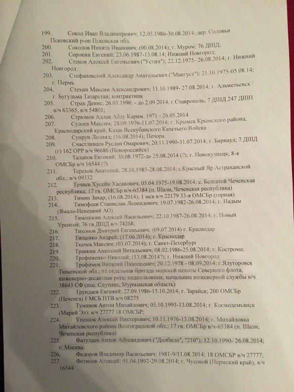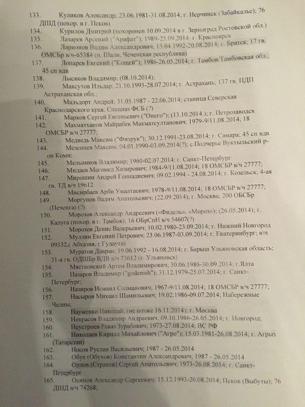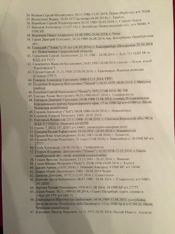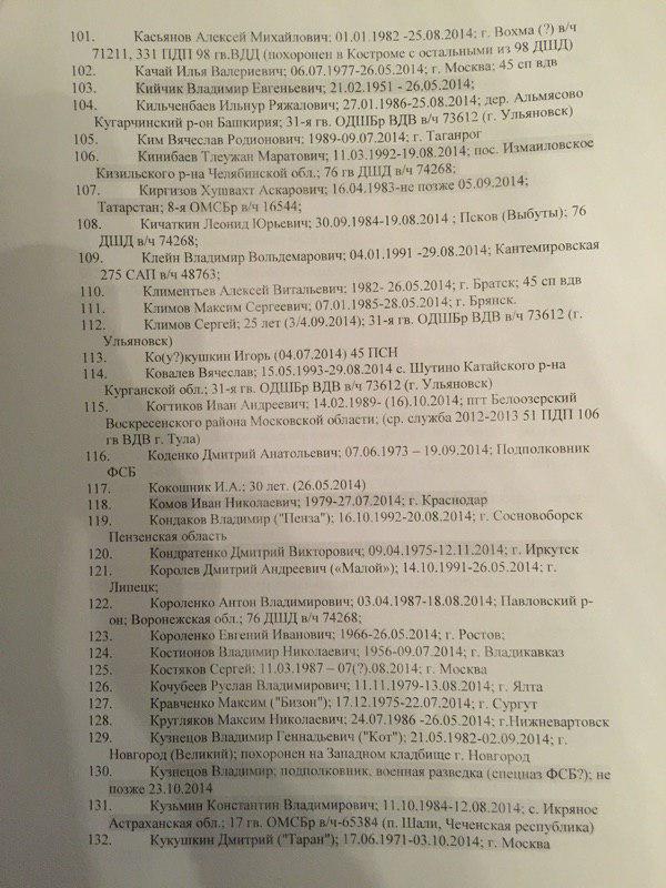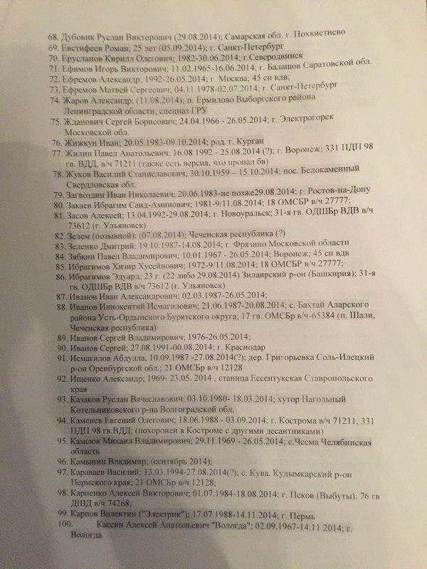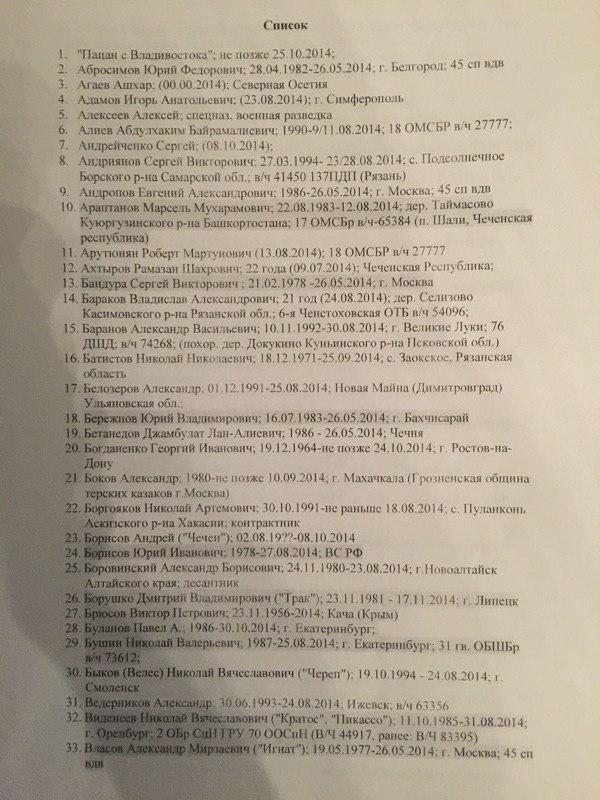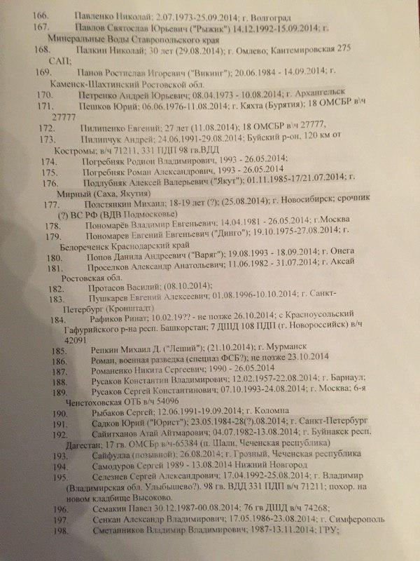 В представленном списке 227 фамилий. При этом сообщается, что "смерть многих людей из списка подтверждается открытыми источниками". Так, по словам специального корреспондента ИД "Коммерсантъ" Ильи Барабанова, который неоднократно ездил в командировки в Донбасс и занимался расследованием смертей россиян на этой войне, "в этом списке очень много знакомых фамилий, некоторые проходили по СМИ и соцсетям".