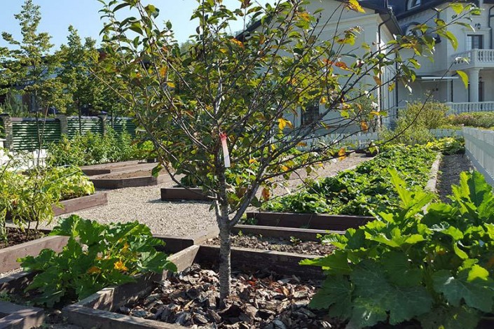 Ограждения на грядках сделаны из дерева, а вокруг - речная галька. Фото: РБК