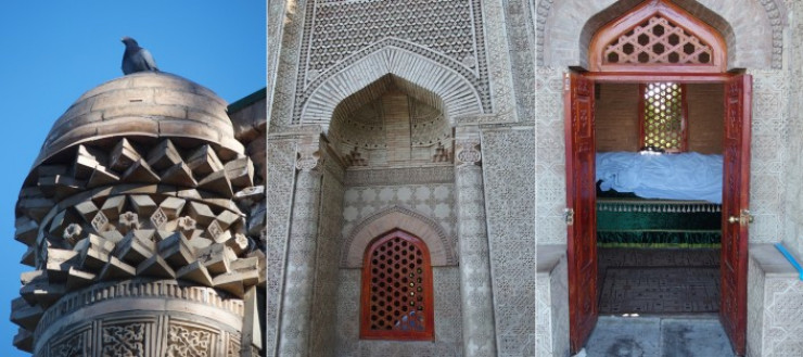 Здание мавзолея представляет собой мощное портально-купольное сооружение, при свете палящего солнца блистающее своим небесно-голубым куполом и глубоким красно-коричневым цветом обожженного кирпича. На входе вас встречает высокий портал, украшенный изразцовыми плитами, а кладка "в елочку" только добавляет всему еще более монументальный вид. Внутри чувствуется дыхание древности.