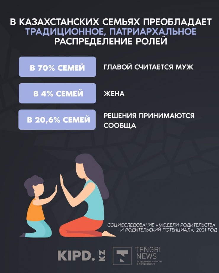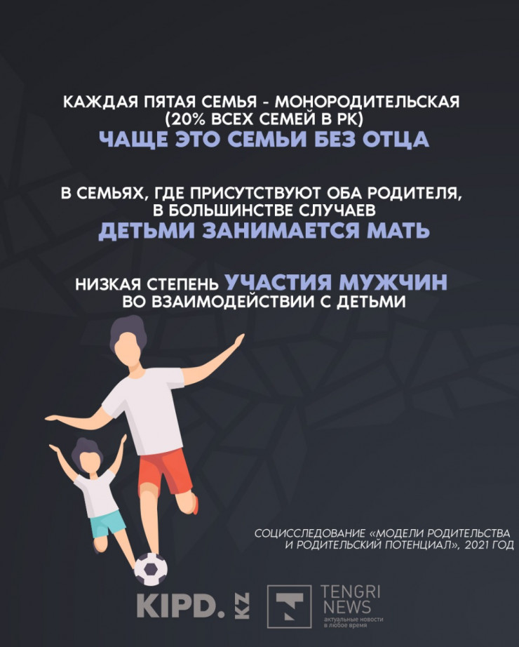 Еще одной проблемой является то, что 20 процентов детей воспитываются в монородительских семьях. То есть, по словам Асем Кайдаровой, каждый пятый ребенок в казахстанской семье воспитывается одним родителем, в основном это матери. И детям зачастую не хватает мужского воспитания.