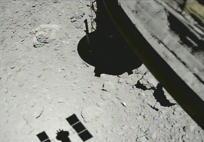 Зонд выстрелил в грунт металлической пулей для дробления гравия, которым усыпана поверхность астероида, чтобы собрать пробы. После этого он взлетел с Рюгу, чтобы вернуться на орбиту до следующей посадки.