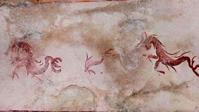 На стенах подземелья изображены воины (один из них, вооруженный луком, мечом и щитом, сражается с пантерой), птицы, танцующие кентавры, гиппокампусы, бог Пан и другие мифологические существа. Помещение получило имя "Комната Сфинкса" - по сюжету одной из фресок.