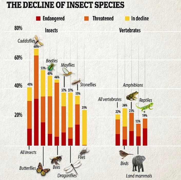 Ученые предрекают цепную реакцию. Когда исчезнут насекомые, умрут от голода животные, которые ими питаются - рептилии, земноводные, птицы. Погибнут и растения, потому что их некому будет опылять. За растениями последуют травоядные, за травоядными — хищники. Так все и вымрут вслед за насекомыми — и люди в том числе, поскольку им тоже будет нечем питаться.