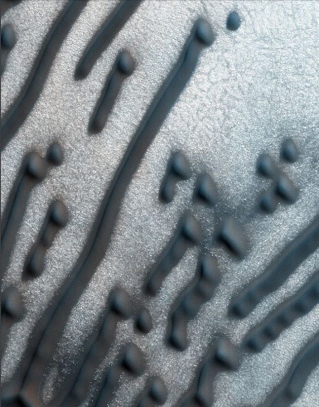 Необычный ландшафт запечатлела на поверхности Марса камера HiRISE, установленная на автоматической межпланетной станции Mars Reconnaissance Orbiter (она фотографирует поверхность небесного тела в ближнем инфракрасном диапазоне и видимом свете). Среди песков Красной планеты специалисты увидели дюны, образующие причудливую серию точек и тире, похожих на азбуку Морзе, передает RT.