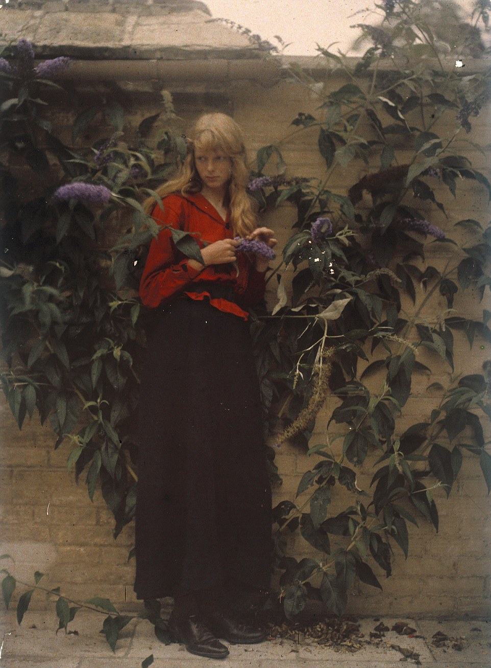 Потрясающие фотографии, на которых запечатлена юная белокурая красавица в красной блузе, сняты по методу автохрома, запатентованному братьями Люмьер в 1903 году во Франции. Мервин был пионером в применении этой техники. Он использовал стеклянные пластины, покрытые картофельным крахмалом, частицы которого окрашивались в три цвета: красный, синий и зеленый.