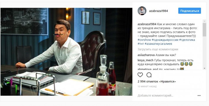 "Как и многие словил один из трендов инстаграма - писать под фото: не знаю, какую подпись оставить к фото – придумайте сами! Придумааааетеее?)))", - подписал фотографию Азамат Мусагалиев (орфография и пунктуация сохранены).