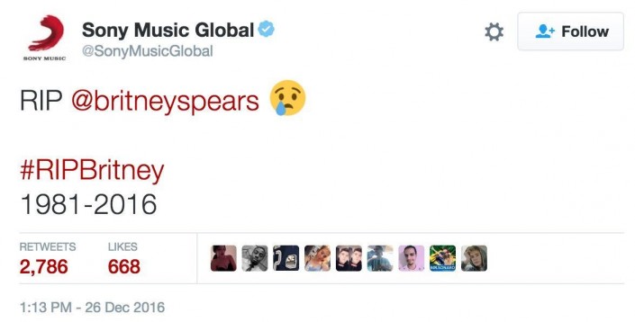 "Бритни Спирс умерла в результате несчастного случая. Покойся с миром", - говорилось в аккаунте Sony Music Global. В настоящее время записи нет в официальном аккаунте звукозаписывающей компании.
