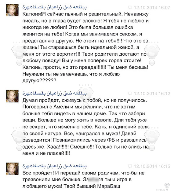 39-летняя актриса призналась, что переписка стала для нее ударом: "Очень неприятно, что эта переписка стала достоянием общественности. Я за весь последний месяц и так столько унижений пережила. Да, мне регулярно приходили сообщения от разных "доброжелателей", целью которых явно было разрушить наши с Маратом отношения. Кто-то никак не мог пережить, что мы поженились и были счастливы. Злопыхателей у нас хватало. Я не удивлюсь, если человек, который все это писал, окажется тем, кого мы с Маратом знаем. Чем руководствовался Марат, когда все мне писал? Надо, наверное, спросить у него самого. Знаете, мне сложно говорить, ведь моя жизнь в последнее время превратилась в какой-то ад...".