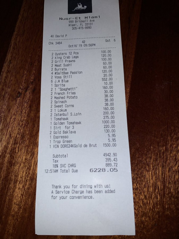 Посетитель ресторана Salt Bae's, основателем которого является знаменитый турок Нусрет Гекче, выложил в Сеть счет за ужин в заведении. Цены шокировали пользователей, передает Tengrinews.kz со ссылкой на LADbible.