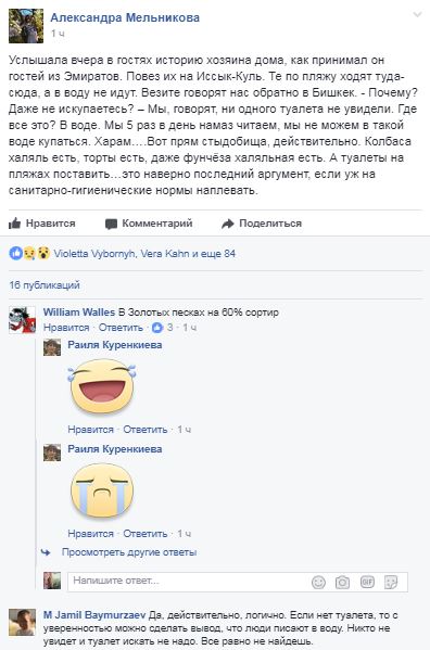 "Повез он гостей из Эмиратов на Иссык-Куль. Те по пляжу ходят туда-сюда, а в воду не идут. После прогулки по песку они попросили отвезти их обратно в Бишкек. На расспросы ответили, что не увидели ни одного туалета. Значит, люди ходят в воду в туалет. Мы пять раз в день намаз читаем, мы не можем в такой воде купаться - это харам. Вот, действительно. Колбаса халал есть, торты есть, а туалеты на пляжах поставить - это, наверно, последний аргумент", - поделилась с читателями автор поста.