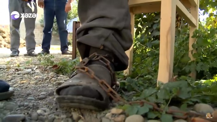 В одном из населенных пунктов Азербайджана местная жительница 20 лет держит родного сына на цепи в хлеву. Шокирующие кадры показали в анонсе передачи "Səni axtarıram" ("Ищу тебя") на телеканале Xəzər.