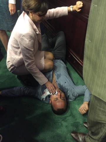 Отмечается, что в этот момент Хахулин бросился защищать главу облсовета. В ответ Карлюк правым хуком ударил в левую часть черепа. По сообщениям портала "Страна.UA", у отправленного в нокаут депутата диагностировано сотрясение мозга и сломана челюсть.