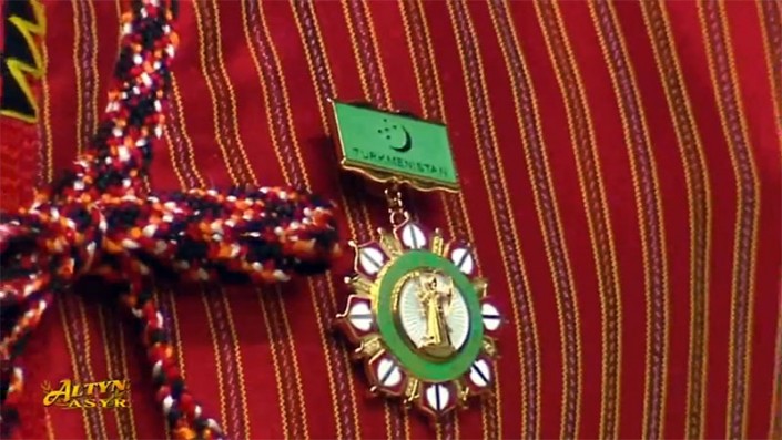 Перед вручением нагрудного знака Бердымухамедов переоделся в традиционную туркменскую одежду - дон и белый тельпек.