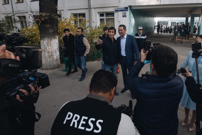 Омурбек Бабанов фотографируется с журналистом из Казахстана. Фото Tengrinews.kz