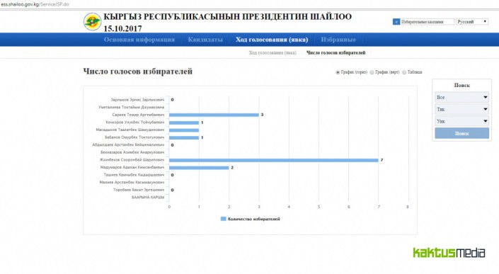 Судя по графику, больше всего голосов (семь) набрал Сооронбай Жээнбеков, далее идут Темир Сариев (три), Адахан Мадумаров (два), Омурбек Бабанов (один) и другие.