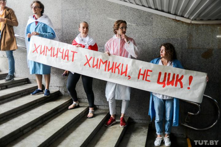 Около сотни человек собрались у входа в главный корпус Белорусского госуниверситета в Минске. Пошел сильный дождь, и собравшиеся спустились в подземный переход. Сотрудники и студенты подписывают петицию, среди требований: отставка Александра Лукашенко и главы ЦИК Лидии Ермошиной, проведение новых выборов, а также прекращение насилия и привлечение к ответственности виновных в пытках и издевательствах, освобождение политических заключенных.