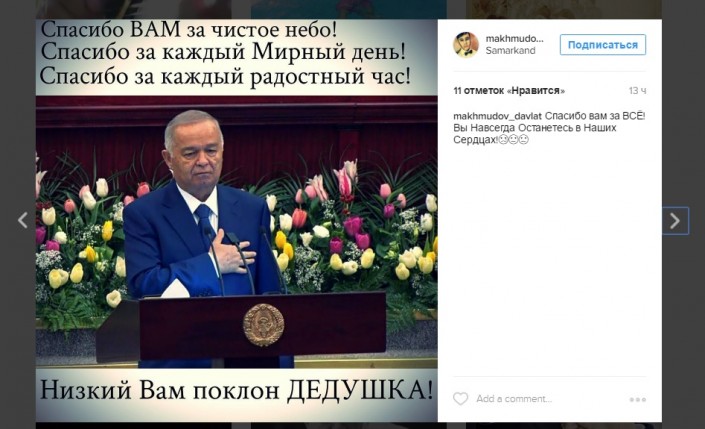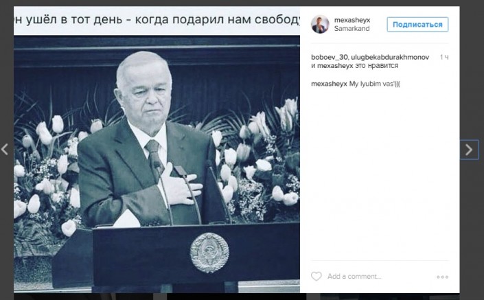 Пользователи Instagram из Ташкента и Самарканда выкладывают в социальной сети фотографии президента Узбекистана. Многие благодарят Ислама Каримова за мирное небо над головой, за независимость. "Будем помнить вас", "Он ушел в тот день, когда подарил нам свободу", - отмечают пользователи.